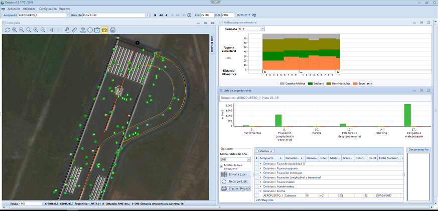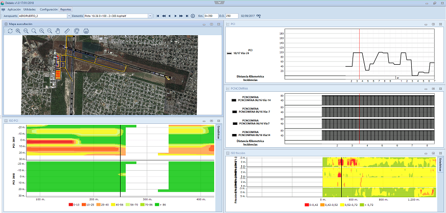 Los parámetros estructurales y funcionales de los pavimentos, recogidos mediante dispositivos de alto de alto rendimiento o visualmente, se cargan en el sistema. Estos datos se visualizan mediante gráficos, histogramas, temáticas y tablas. Además, pueden visualizarse distintos parámetros técnicos (PCN. PCI, etc.) pueden representarse. Además, DEDALO calcula automáticamente el PCI a partir de los datos recogidos.