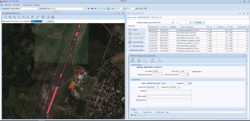 Registro de la sección estructural del pavimento, mostrado en listados y gráficamente, así como el histórico de las actuaciones realizadas en el pavimento, con sus características (fecha de ejecución, materiales empleados, características de los materiales y capas, etc.). Todo ello georreferenciado y visualizable en la cartografía por año y tipo de actuación realizada.