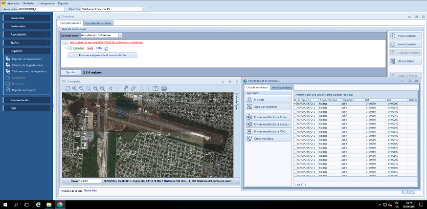 Módulo que permite realizar consultas y generar informes sobre cualquier dato contenido en la base de datos del sistema. La información puede visualizarse sobre la cartografía o en tablas, exportables en múltiples formatos.