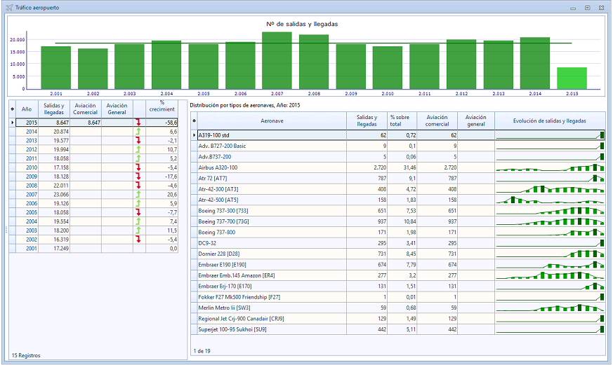 Se muestran o editan datos de tráfico del aeropuerto, permite ver la evolución de salidas por aeronave y la representación gráfica de salidas y llegadas, el tipo de aeronave y el número de aterrizajes registrados distinguiendo entre aviación comercial y/o general. Estos datos serán utilizados por el PMS para los cálculos de evolución del pavimento, así como para la obtención de la comparativa ACN-PCN requerida por la OACI.