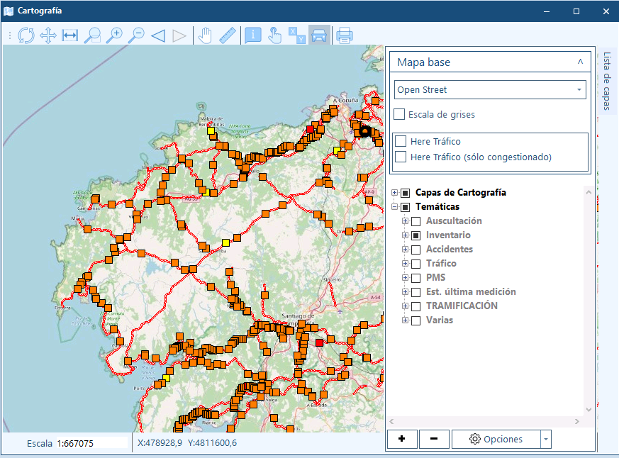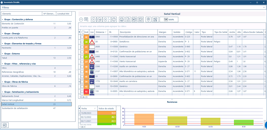 Contiene el inventario de todos los elementos de la red: marcas viales, señalización vertical, equipamiento, entorno, hitos, estructuras... ubicados en las carreteras. Cada uno de ellos cuenta con una ficha personalizada, que registra sus características: localización, estado, históricos de revisiones y actuaciones realizadas.