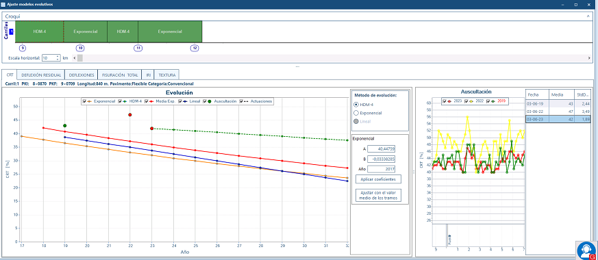 Este módulo segmenta automáticamente las carreteras en tramos de comportamiento homogéneo. Cada uno de ellos quedará caracterizado por valores estadísticos de auscultación, de manera que puedan ser analizados mediante la Gestión Experta de Firmes.