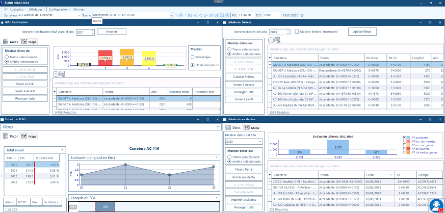 Contenida toda la información de la accidentalidad de las carreteras, ÍCARO obtiene de forma automática los Tramos de Concentración de Accidentes, el Índice de Peligrosidad y el Índice de Mortalidad, datos imprescindibles para el análisis de la seguridad vial de la red.