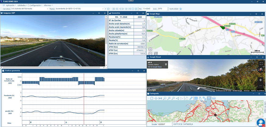 ICARO muestra, de forma gráfica y numérica, los datos geométricos de peralte, pendiente y radio de curvatura, datos obtenidos por equipos de alto rendimiento con sistema inercial incorporado.