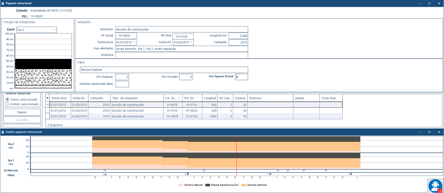 El mantenimiento actualizado de la información contenida en este módulo permite conocer la sección estructural actual de toda la red, así como el histórico de todas las actuaciones realizadas sobre el pavimento, con sus correspondientes características (fecha de realización, materiales utilizados, empresa que realizó la obra…).