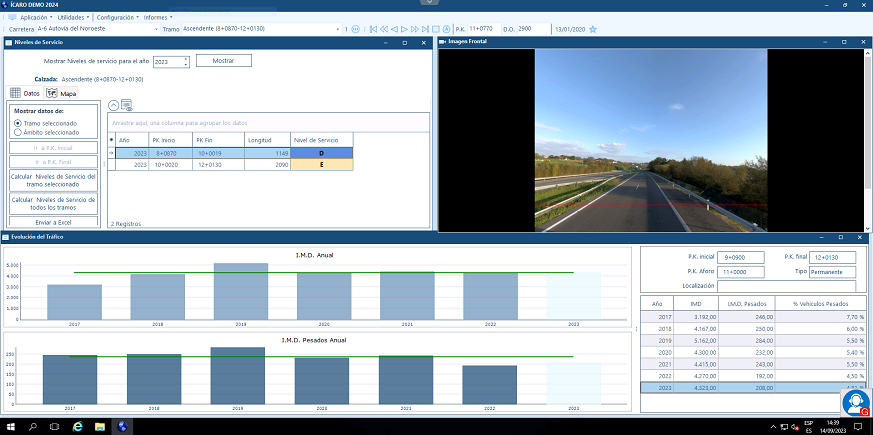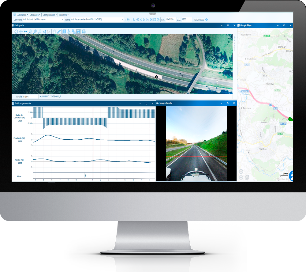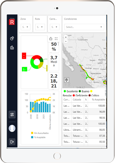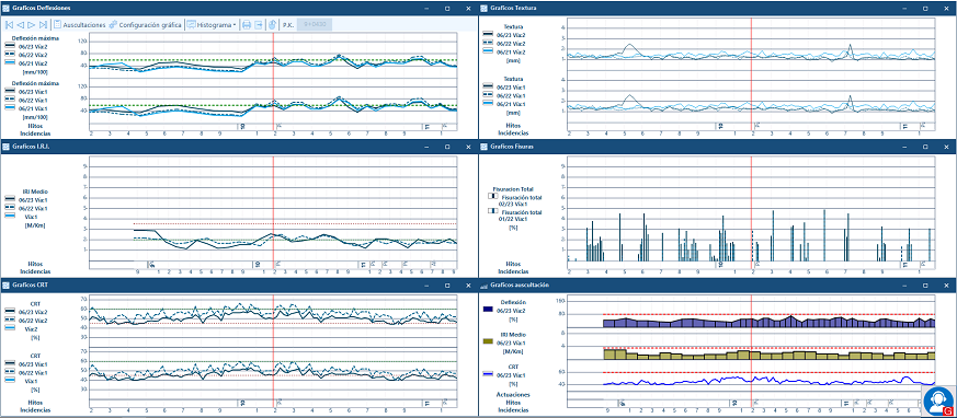 Se pueden consultar todas las medidas tomadas con equipos de alto rendimiento: valores históricos, estadísticos, etc., correspondientes a las características estructurales y funcionales del pavimento. Estos datos son accesibles a través de gráficos, histogramas, temáticas y tablas.
