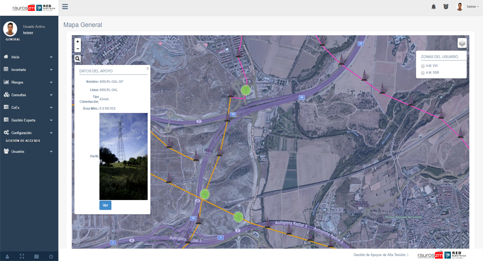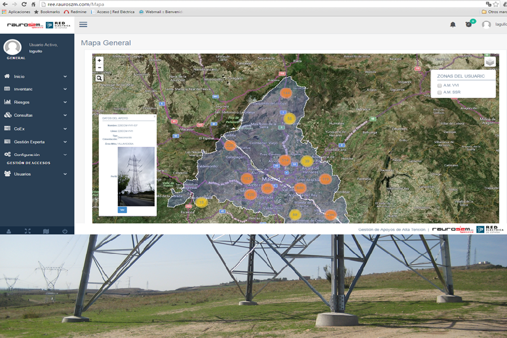 Sistema experto de gestión de activos de redes eléctricas de alta tensión. Sistema web multiplataforma, escalable y adaptable a cualquier infraestructura formada por elementos geo-referenciados. Permite establecer niveles umbral en base a indicadores para gestionar la conservación y el mantenimiento, creando operaciones y grupos de trabajo para distribuir los recursos temporalmente.
